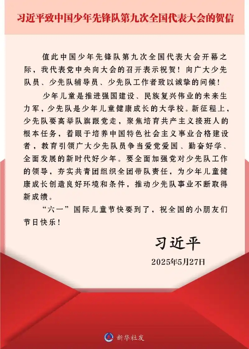 習(xí)近(jìn)平緻信祝賀中國(guó)少(shǎo)年(nián)先鋒隊第九次全國(guó)代表大(dà)會(huì)召開(kāi)強調高(gāo)舉隊旗跟黨走培養中國(guó)特色社會(huì)主義事(shì)業(yè)合格建設者祝全國(guó)小(xiǎ&o)朋(péng)